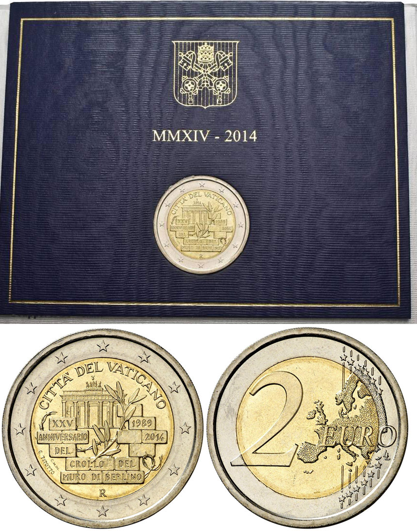 2014 Vatican 2 Euro bi-metal coin commemorating the 25th anniversary of the fall of the Berlin Wall. Brilliant Uncirculated condition in original folder.